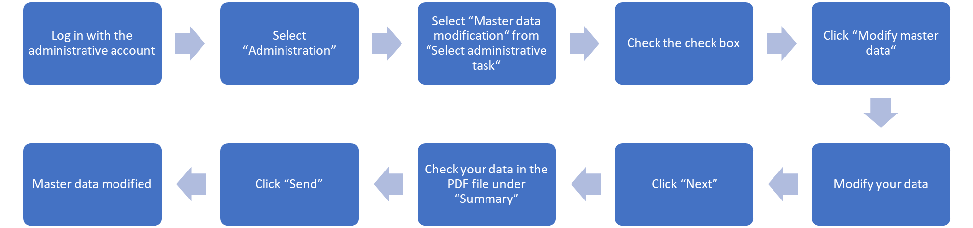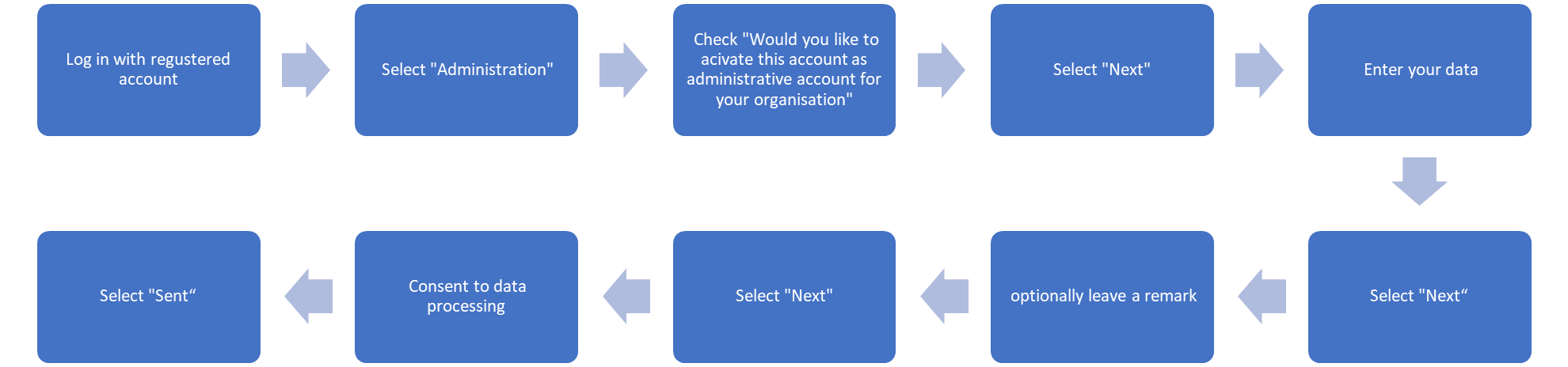 The registered user is now assigned to your administrative account (assuming he/she was not already assigned to a different one) and can place orders or apply for services for your organization using the E-Service.